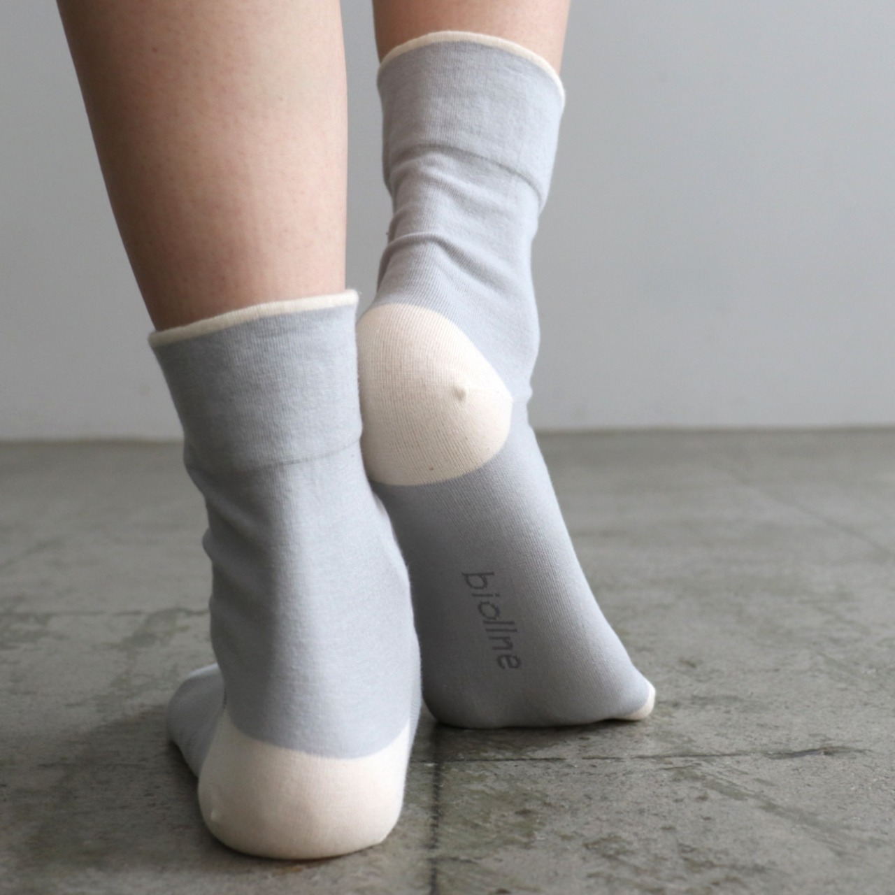 Organic Cotton糸を使用した口ゴム無しバイカラーソックスは、口ゴムがないことで締め付けがなく、靴下の跡が残りにくいのが特徴。